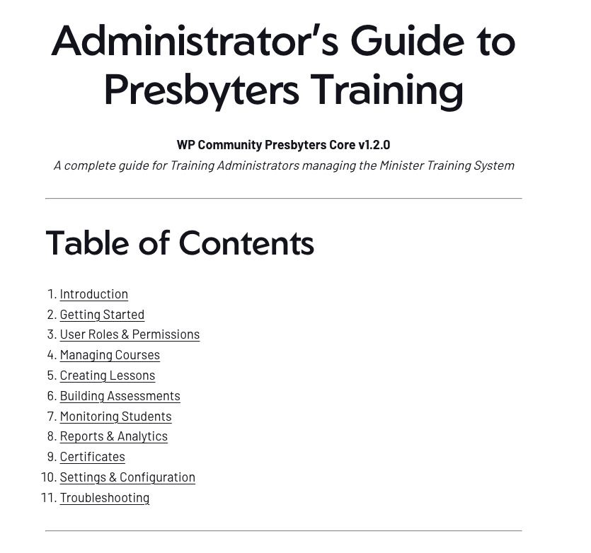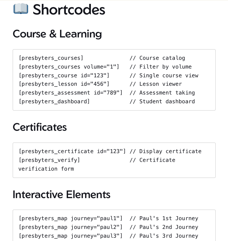 The WP Community Presbyters Core plugin uses shortcodes to display training content on your WordPress pages. This guide walks you through creating each page your training system needs.